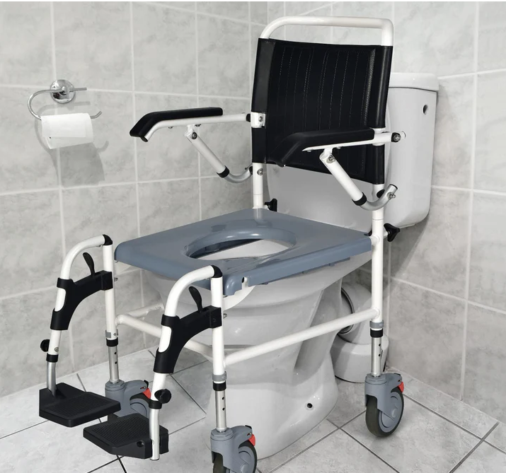 - Versatile assistance with combined function as a shower chair, commode, and transport chair.